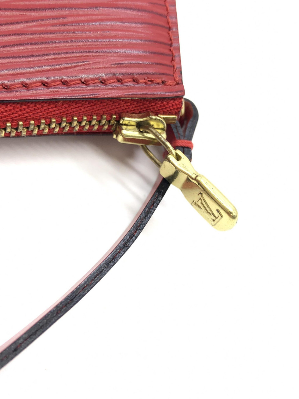 Discover the allure of luxury with this exquisite Louis Vuitton Red Leather Pochette Accessory Bag. Crafted from the iconic Epi leather, this piece embodies sophistication and timeless elegance. Graded B+ for its very good condition, this bag is a testament to Louis Vuitton’s commitment to quality and style.